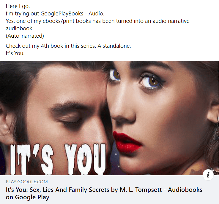 This week has also seen the release of my 4th book in the Sex, Lies and Family Secrets, series – It’s You, became an audio book! Yes, and audio book. Currently it is only on GooglePlay store – audio books.